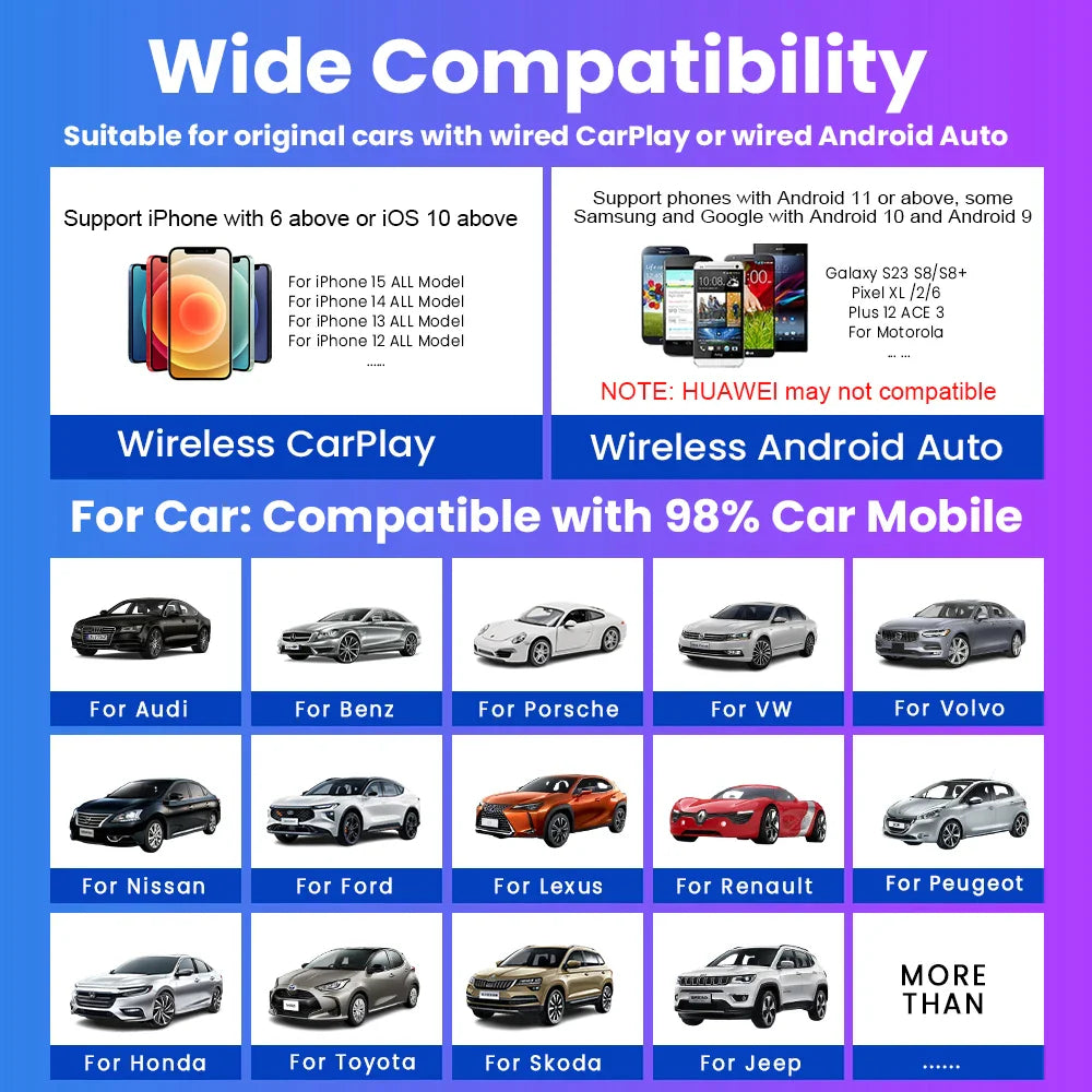 Easily upgrade your factory-wired CarPlay system with this 2-in-1 Wireless CarPlay & Android Auto Smart Dongle. Enjoy cable-free convenience with seamless plug-and-play operation, OTA updates, and universal compatibility with 98% of wired CarPlay-enabled vehicles.