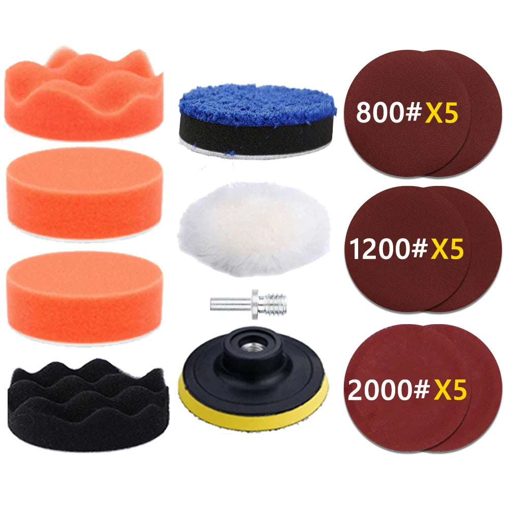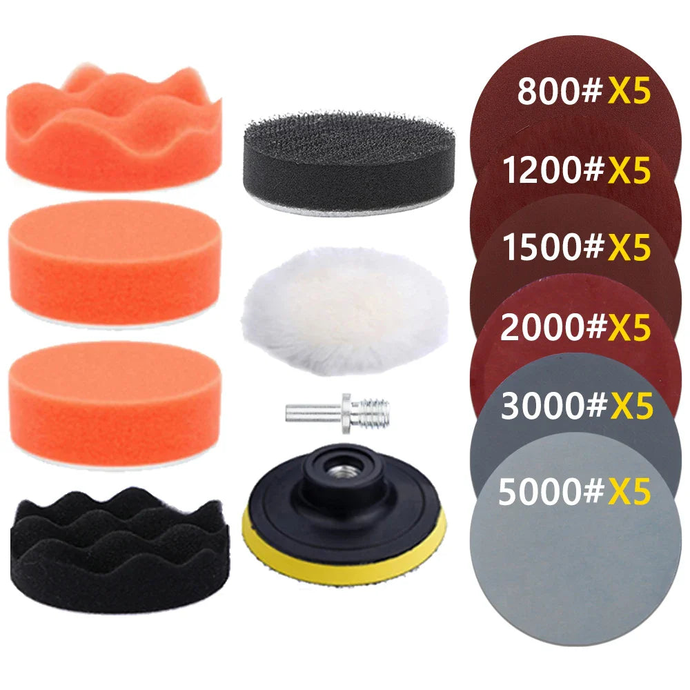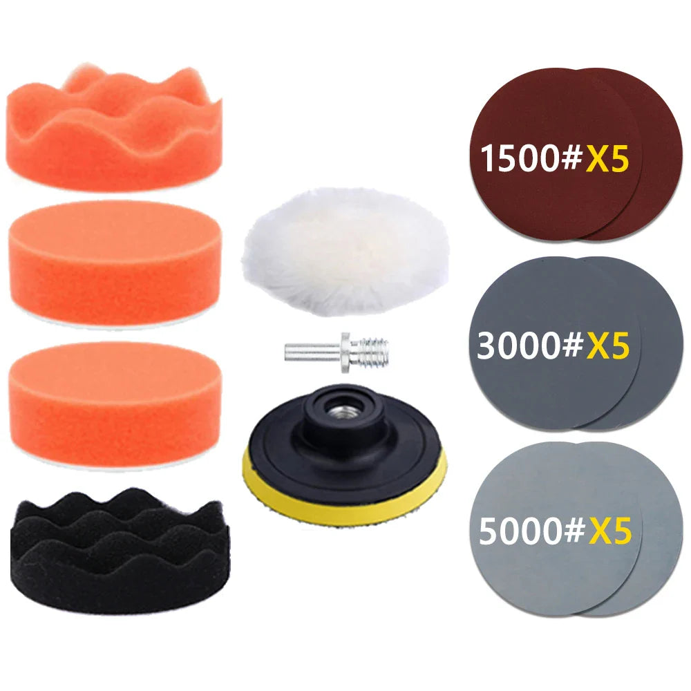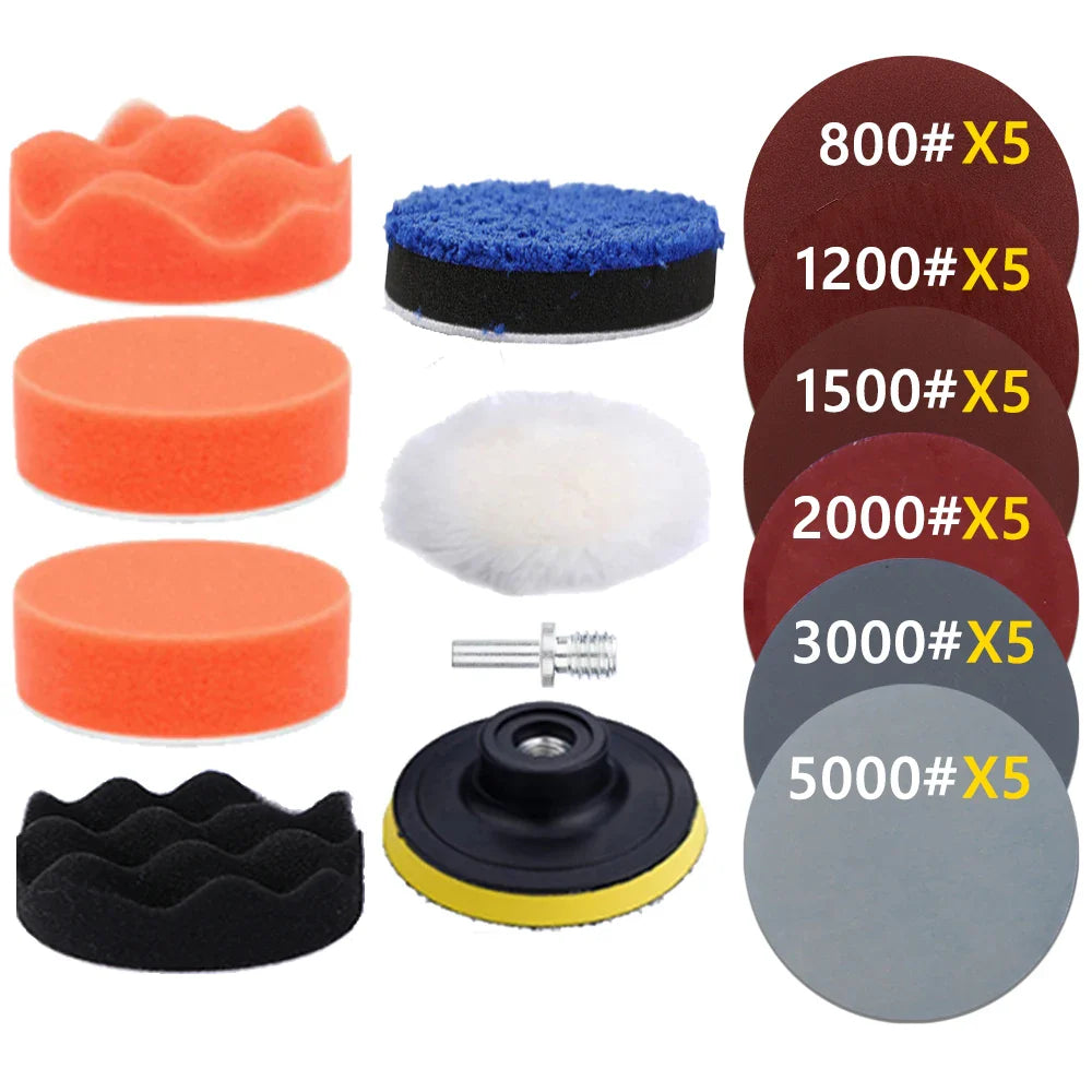 All-in-One Kit – Includes polishing sponge pads, sanding discs, and a wool buffing pad