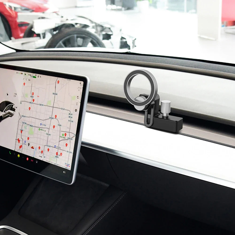 Enhance your Tesla driving experience with this universal smartphone holder — designed for quick access and 360° rotation for optimal viewing.