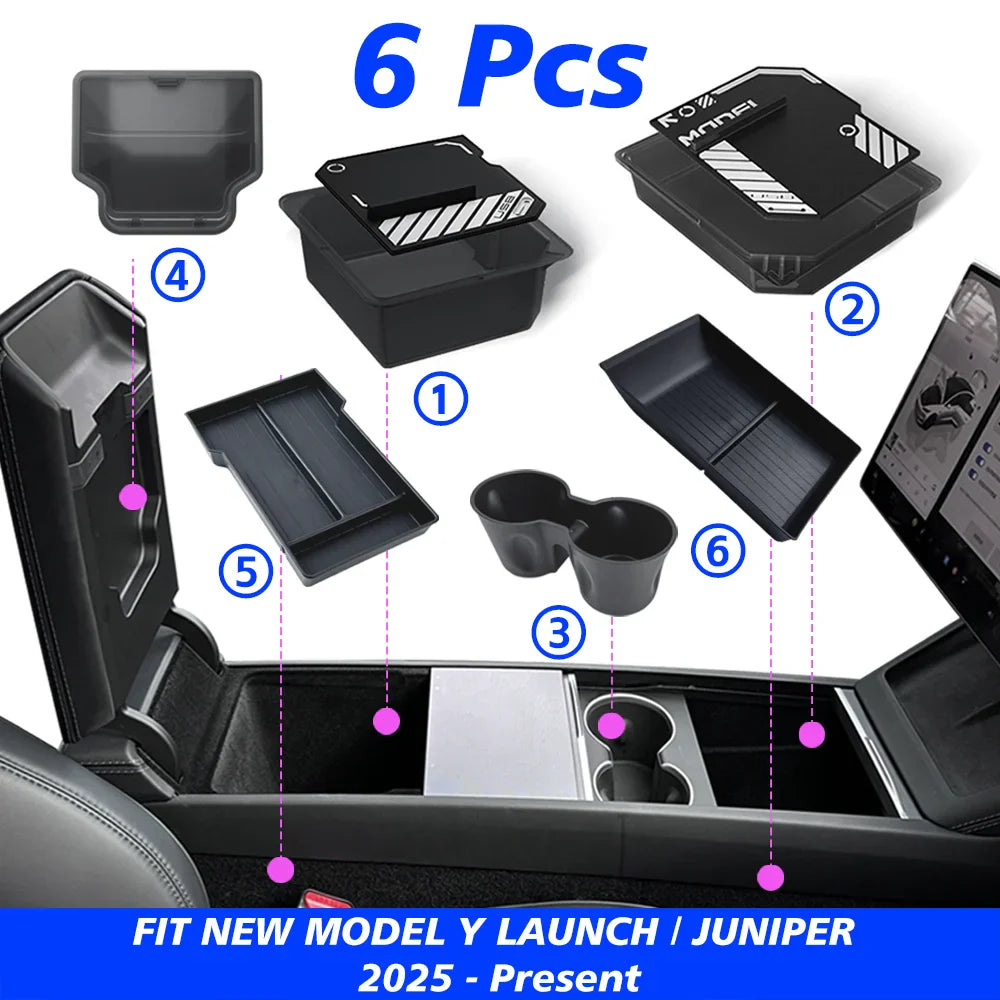 Tesla New Model Y 2025 Launch Juniper ABS Storage Box – With Silicone Non-slip Mat for Console, Armrest & Upper/Lower Water Cup