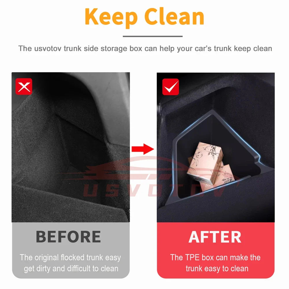 ✅ Easy to clean- The original design of Model Y is made of flocking material, it is difficult to clean. The usvotov trunk side storage box is made of soft tpe material, it can help your trunk keep organiser and easy to clean ;