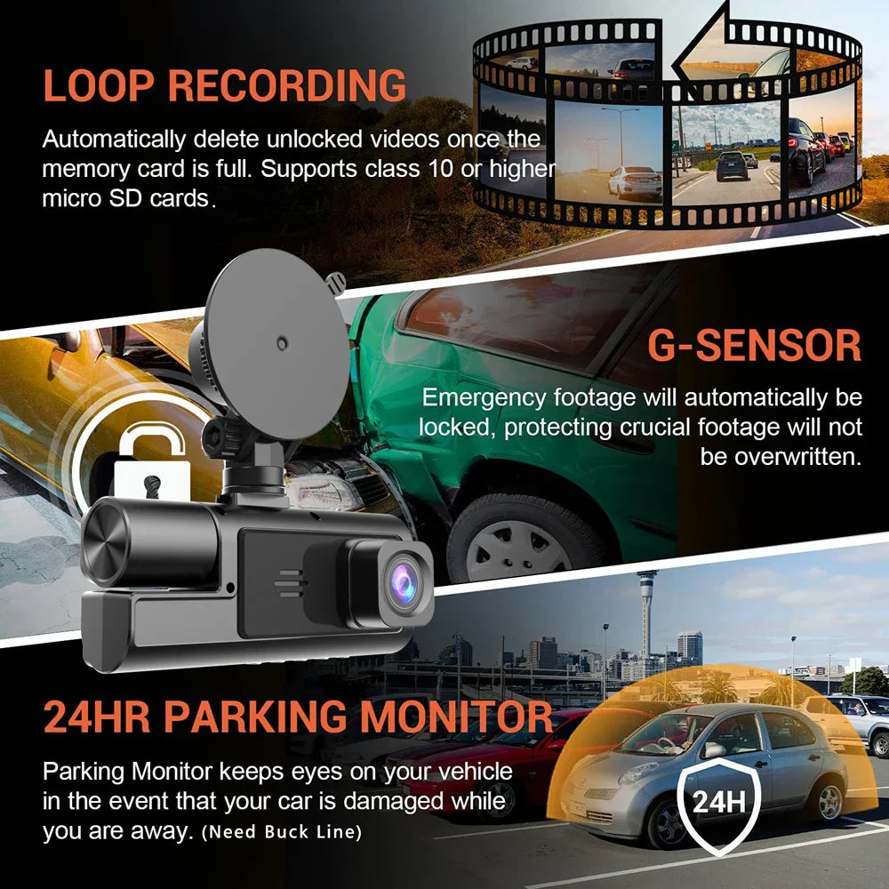 Monitor every angle of your vehicle with this 3-camera dash cam — capturing front, inside, and rear views in sharp 1920P resolution with WiFi connectivity for easy playback and sharing.