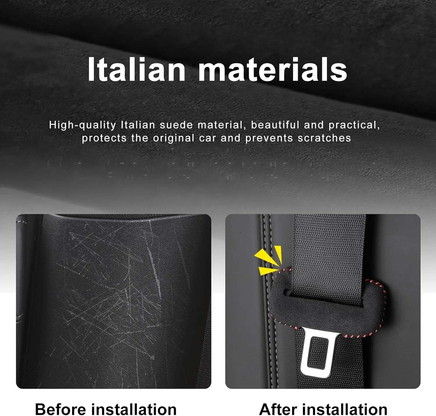 Soft suede material reduces seat belt friction on the shoulder and chest