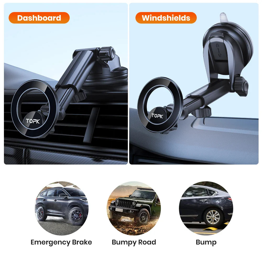 Experience secure, hands-free driving with the TOPK MagSafe car phone holder — featuring a powerful magnetic mount, retractable arm, and compatibility with MagSafe and all smartphones.