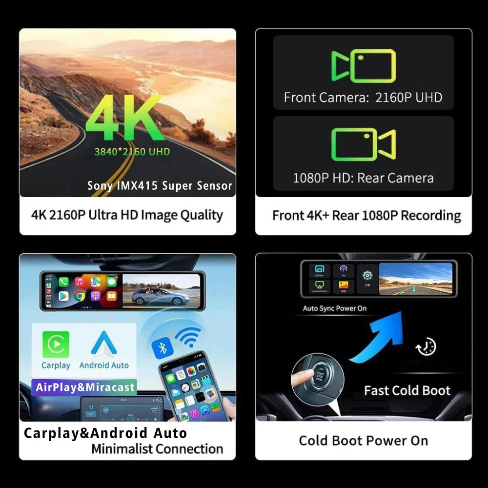 11.26" 4K 2160P Car DVR – Rear View Mirror Dash Cam with CarPlay & Android Auto