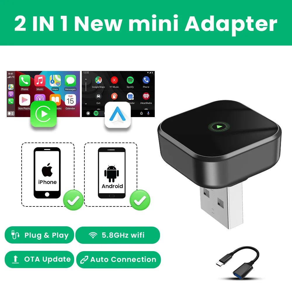 2-in-1 Wireless CarPlay & Android Auto Adapter – Smart Dongle with Plug & Play & OTA Updates