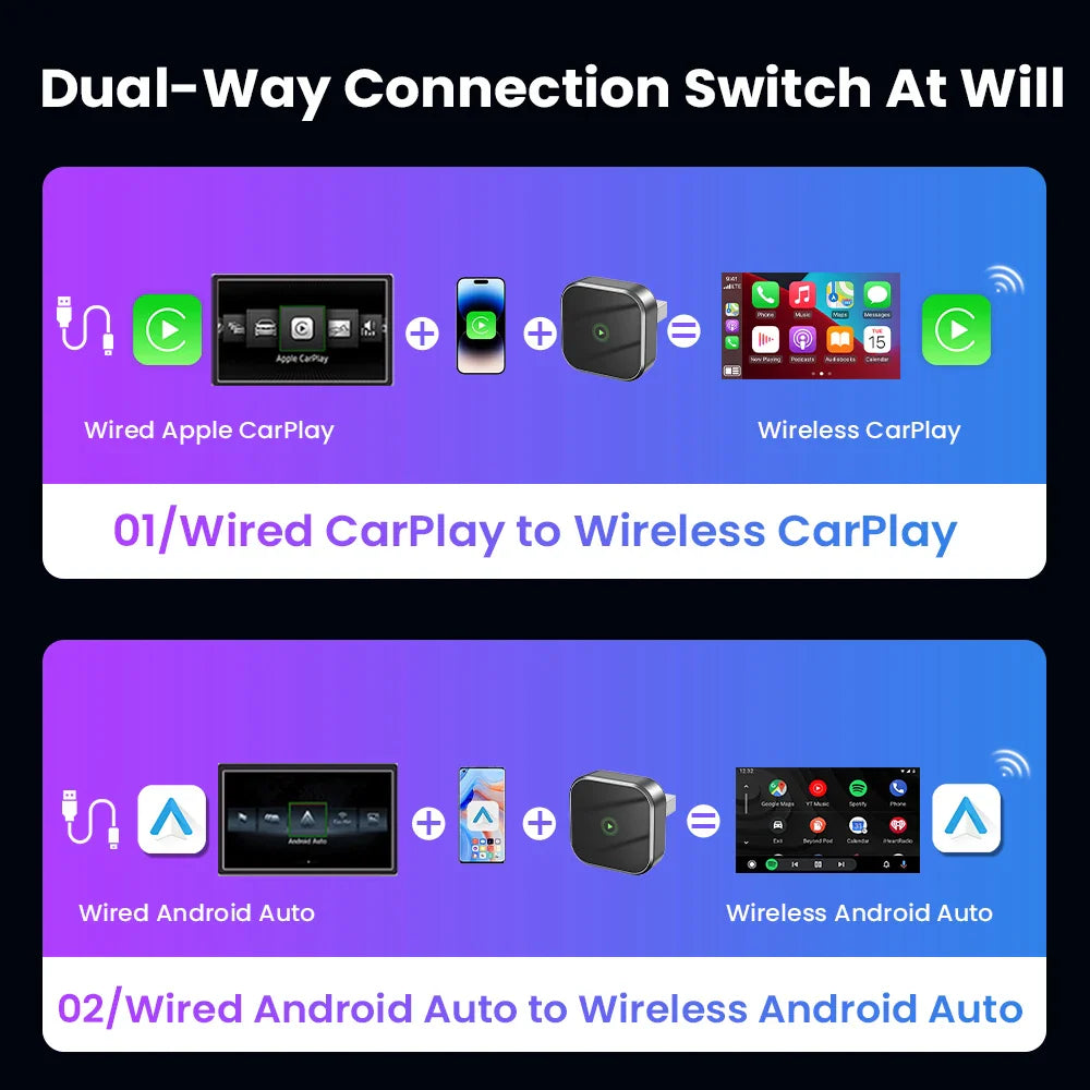 Enjoy full wireless freedom — upgrade your drive with the 2-in-1 Smart Dongle for Wireless CarPlay & Android Auto today!