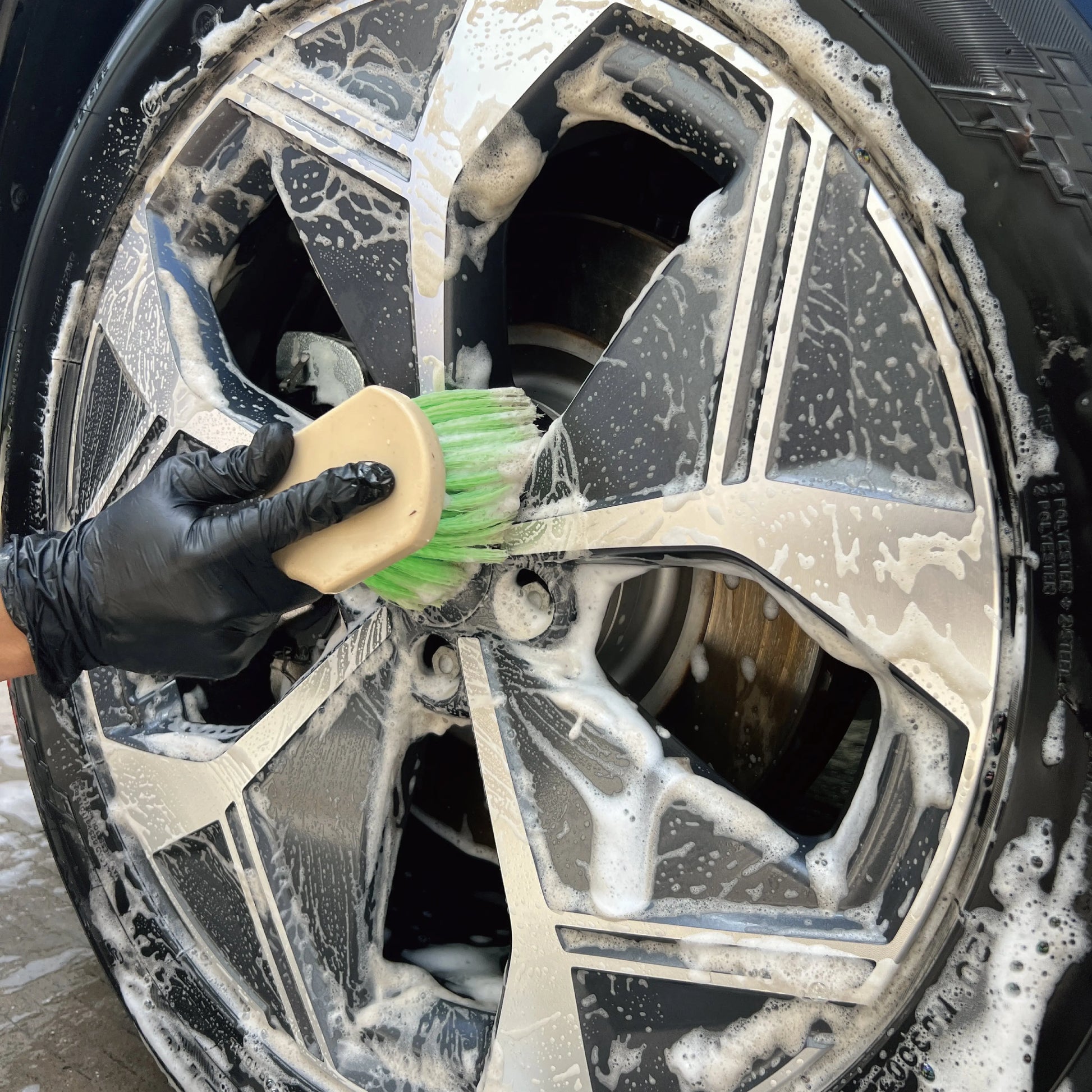 Advanced chemical cleaning agents designed to safely break down tough grime, iron powder, and rust without damaging rims or tires.